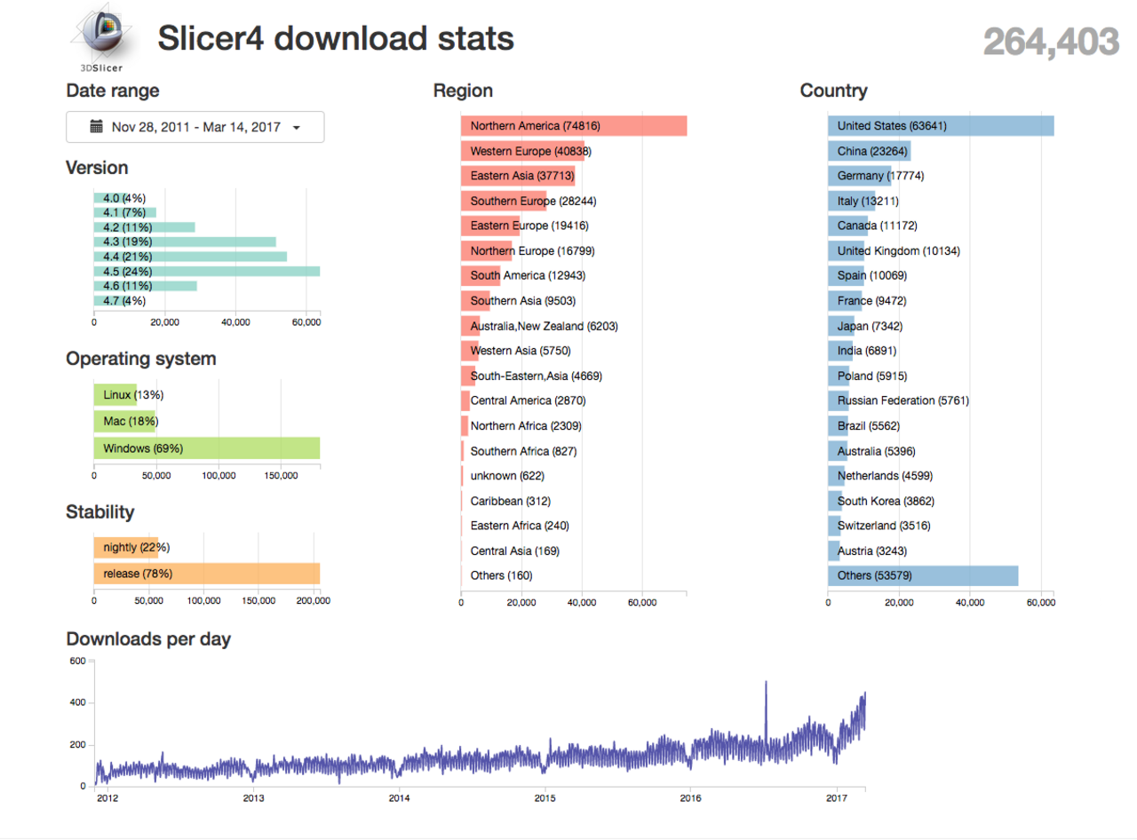 Version 4 of the 3D Slicer application, created and supported by NAC for nearly two decades, has surpassed the 260,000 download milestone since it was released in 2011. The most recent version 4.6.2 has been downloaded at a rate of over 290 downloads per day in the first two and a half months of 2017, with a clear trend toward steadily a steadily increasing download rate. These download statistics are evidence of the worldwide impact of the free and open source 3D Slicer software and the valuable part it plays in enabling science and clinical research across a range of applications. In addition to core functionality in image visualization, analysis, segmentation, and registration, 3D Slicer is fully extensible and programmable. As a software platform, 3D Slicer includes an 'app store' with hundreds of add-on software modules developed by investigators at dozens of academic and commercial sites. Specialized research communities have formed in over a dozen domains to create and support software customized to the needs of their work. Very active and productive multi-institution research teams such as the SlicerRT community for radiation therapy research, the SliceCMF team developing dental and craniomaxillofacial surgery software, SlicerDMRI for diffusion imaging, and the SlicerPathology team developing analysis tools to study digitized histology images are prime examples of the diverse research that can build around a common software base. The NAC Slicer Core continues to help steer the world-wide community of 3D Slicer users and developers while working to improve the core architecture to address the next generation of imaging software research challenges.